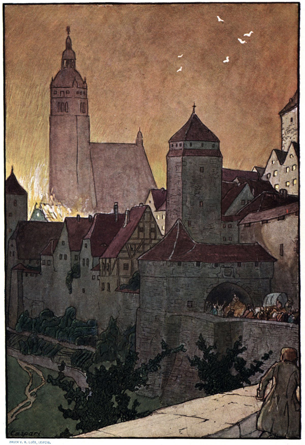 Der anbrechende Morgen sah den dritten Teil der Stadt in Asche und Flammen, und noch immer spottete das Feuer aller menschlichen Gegenwehr. Es hatte inzwischen nach dem Marktplatze heraus gebrannt, und eben jetzt mit Tagesanbruch loderte das schöne Rathaus auf seinen steinernen Säulen mit seinen gemalten Fenstern, welche die Wappen besiegter Ritter trugen, und seinem Sturmbock, dem Siegesdenkmal aus noch älterer Zeit. Dieser Mauerbrecher war von dem Heere des Hohenstaufengegners, als es die Belagerung der Stadt ausheben mußte, zurückgelassen und von den Bürgern Jahrhunderte lang in der über ihm erbauten Kirche aufbewahrt worden, bis Kaiser Max bei einem Besuch der Stadt das Kriegswerkzeug aus dem Gotteshause entfernen hieß; da die Kirche fast rings von Häusern umgeben war, die ihm keinen Durchgang gestatteten, so durchbrach man die Mauer im Thor und schob den mehr als hundert Werkschuhe langen Widder nach der einzigen freien Seite hinaus, worauf er am Rathaus aufgehängt wurde, mit dem er jetzt bis auf den eisernen Schnabel verbrannte. Noch immer stießen die Straßen dicht an die hohe Marienkirche, und wer über den eigenen Jammer noch hinausdenken konnte, der zitterte für das Kleinod der Stadt, als die lange, vom unteren nach dem oberen Tore führende »Kramergasse« nun auch aufwärts vom Marktplatz zu brennen begann. Sie lag zwischen zwei Feuern, die sie von den beiden hinter ihr brennenden Gassen her zugleich ergriffen. Man riß die größten Gebäude an der Kirche ein, und zu gleicher Zeit wälzte sich die Flammenmasse nach Süden weg, so daß die Umgebung der Kirche völlig frei vom Feuer wurde; aber das Glutmeer, von dessen Atem das Wasser in den Röhrenbrunnen sott, die hölzernen Staffeln im Bache verbrannten und die dicksten Fässer in den Kellern zu Asche wurden, hauchte auch nach der Spitze des Turmes empor, und von oben herab wurde die Kirche ein Spiel der Flammen.