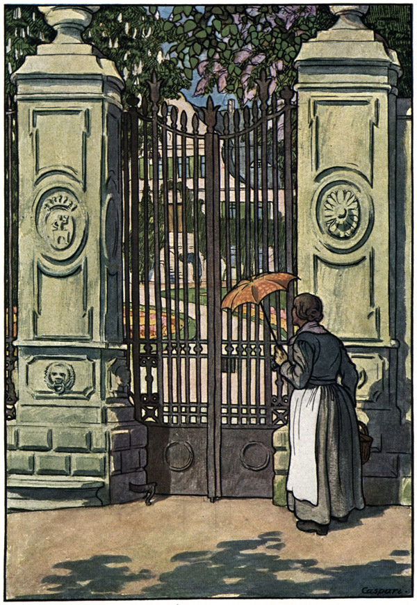 Vor einem hohen, eisernen Gittertore machte Gritli halt. Zwischen stattlichen Sandsteinpfeilern stand das Portal da, mitten in einer hohen, steif verschnittenen Tuyahecke, und kündete mit seiner, noch der Napoleonszeit entstammenden Schmiedearbeit und Wappenzier ein ansehnliches Besitztum an. Gritli zog behutsam die Glocke; eine dienstbare Person, die dort hinten die steinerne Vortreppe gekehrt hatte, kam heran und ließ die Nähterin mit vertraulichem Gruße ein. Es war eine gar seltsam vierschrötige Magd, und man wäre weniger erstaunt gewesen, sie um etliche Gärten weiter im Kuhstall des dortigen Milchbauern anzutreffen, als hinter diesem herrschaftlichen Gittertore. Ein gutes Grinsen ging über ihr rotes Scheibengesicht, als sie Gritli die Hand drückte und ihm dienstfertig sein kleines Päckchen abnahm.