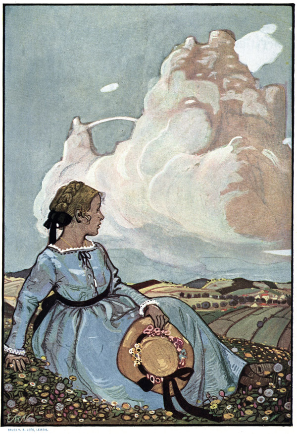 »Was nicht noch?« lachte sie. »Das kann nimmer geschehen. – Da steht ein Engel vor dem Tor und will dich nicht hineinlassen. Denn du tätst mit den Füßen die Blumen zertreten, die drin wachsen, und die Stadt ist auch wie ein einziger Garten. Alles, was drin lebt, ist leicht wie Luft und doch schwer genug, um sich selbst zu tragen. Der Himmel ist weit aufgetan, weil er auch gern die Blumen sieht, die den ganzen Grund auszieren. Und der Amering fliegt hinauf zur Sonne und ist ihr Gast. Dann kommt er wieder und erzählt, was es dort Schönes gibt und alle hören ihm gern zu, wenn er davon singt. Wie willst denn du in die Stadt kommen, du bist ja nicht von Luft!«