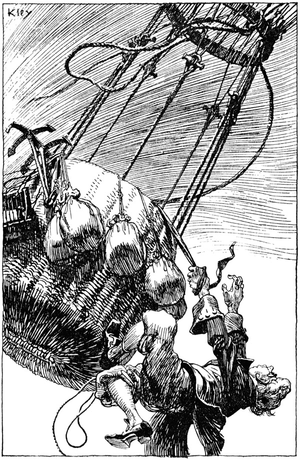 Doch so seltsam es auch klingt – ich empfand weder Staunen noch Schrecken. Wenn ich überhaupt etwas spürte, so war es höchstens eine Art von Genugtuung über die Geschicklichkeit, die ich jetzt gleich entfalten wollte, um mich aus dem Dilemma zu befreien. Und keinen Augenblick lang schien mir meine Sicherheit auch nur im geringsten gefährdet. Einige Minuten überlegte ich, was nun zuerst zu tun sei. Ich erinnere mich deutlich, daß ich dabei oft die Lippen zusammenpreßte, meinen Zeigefinger an die Nase legte, kurz, alle die Bewegungen und Grimassen vollführte, durch die sich andere Sterbliche, wenn sie gemütlich daheim im Lehnstuhl über verzwickte oder wichtige Sachen nachgrübeln, auszeichnen. Nachdem ich meine Gedanken genügend gesammelt hatte, brachte ich mit der größten Vorsicht und Überlegung meine Hände auf den Rücken und löste die große Eisenschnalle, die den Gürtel, der meine Beinkleider trug, zusammenhielt. Diese Schnalle hatte drei Zähne, die ein wenig rostig waren und sich nur sehr schwer in ihren Achsen drehten. Mit vieler Mühe brachte ich es so weit, daß sie im rechten Winkel zu der Schnalle selbst standen, und freute mich sehr, daß sie in dieser Lage unverrückbar fest blieben. Dies Instrument hielt ich nun mit den Zähnen fest und begann den Knoten meiner Krawatte zu lösen. Ich mußte verschiedene Male ausruhen, ehe ich das Werk zu Ende brachte, endlich war ich fertig. An dem einen Ende der Krawatte befestigte ich den Gürtel, das andere band ich, der größeren Sicherheit wegen, um mein Handgelenk. Durch eine fabelhafte Anstrengung all meiner Muskelkraft schleuderte ich meinen Körper nach oben, und es gelang mir auch beim ersten Versuche, die Schnalle in die Gondel zu schleudern, wo sie sich am oberen Rande fest einhakte.