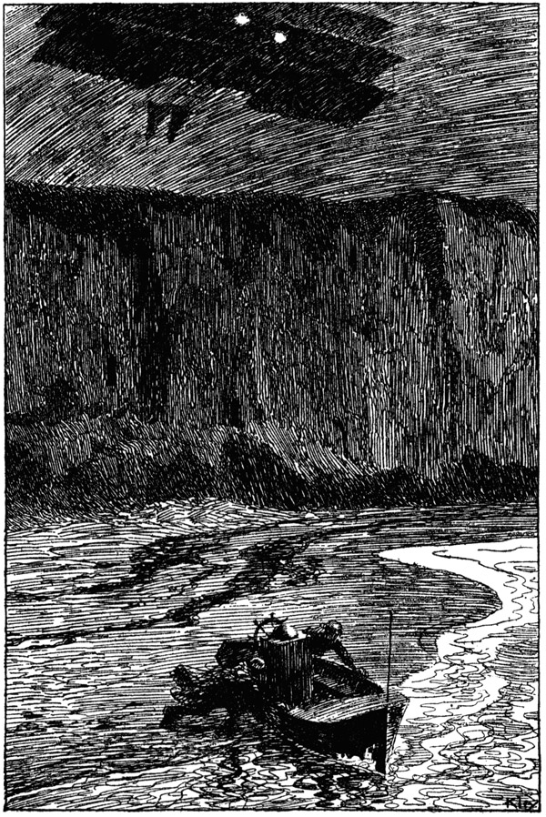 Mit Eiseskälte und Grauen, mit dem Tosen des unsichtbaren Meeres lag die Finsternis dicht und weit um uns her. Minutenweise zeigte der Leuchtturm des Vorgebirges seinen Feuerschein über dem Horizont. Eine einzige kohlschwarze Wolke verfinsterte den Zenit dieser sternenfunkelnden und doch undurchdringlich dunklen Oktobernacht.