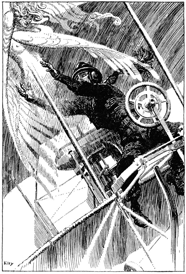 Als er den Kopf wandte, um ein einsames Feld zu suchen, auf dem er ungesehen mit seiner Beute landen könnte, sah er, wie das blaue Wesen im Begriff war, schnell in sich zusammenzusinken, gleichsam von der heißen, giftigen Luft der Erdnähe aufgezehrt. Er ließ das Steuer los, griff aufschreiend nach der Gestalt, griff aber nur noch in ein Etwas, das ihm unter den Händen zerrann, als ob er nur in eine kleine glänzende Frühlingswolke gegriffen hätte.
