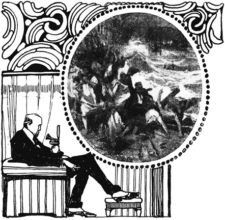 In jüngster Zeit wurde die fabelhafte Kunst der drahtlosen Bildertransmission so außerordentlich vervollkommnet, daß sie kein Spielzeug mehr ist, sondern zweifellos berufen ist, in der Ausgestaltung unserer zukünftigen Lebensverhältnisse eine sehr große Rolle zu spielen. Und wenn diese Erfindung auf die Höhe der Vollkommenheit gehoben sein wird, dann werden wir eine neue Reihe von täglichen Wundern zu verzeichnen haben. Hier ist beispielsweise eine Szene, die sich in hundert oder weniger Jahren alltäglich abspielen wird.
