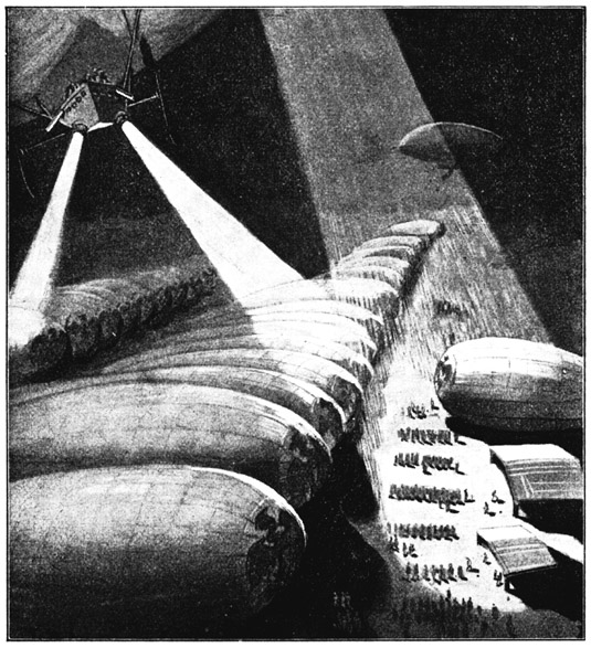 Ein einziges Vakuumluftschiff normaler Größe trägt neben der Besatzung von etwa 500 Mann auf kürzere Entfernungen 950 schwere Dynamittorpedos à 75 kg oder 4750 leichte Dynamittorpedos à 15 kg. Welches Bataillon könnte wohl einen Hagel von 4750 Dynamittorpedos aushalten? Wenn nun aber 20 solcher Vakuumluftschiffe hintereinander fahren, so können sie aus der sicheren Höhe von 1500 Metern die marschierende Infanterie einfach wegrasieren. Breite Streuapparate, die sechsmal so breit sind als eine Landstraße, lassen gleichzeitig die Dynamittorpedos fallen, so daß ein Zielen nicht nötig und ein Nichttreffen ausgeschlossen ist. Der Transport ganzer Armeekorps und Armeen auf den Hauptstraßen eines Landes ist in der Nähe feindlicher Luftschiffe überhaupt nicht mehr möglich.