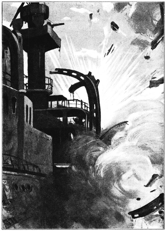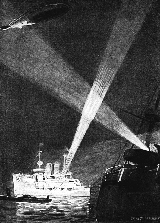 In demselben Moment stellte Hellborn den Indikator auf 300. Wieder senkte das Luftschiff seinen Bug und glitt auf die angegebene Tiefe hinab. Ganz, ganz leise arbeiteten jetzt die Motore. Im Maschinenraum wie in der Torpedokammer sah man wie in einer Camera obscura ganz deutlich in ganz, ganz kleinem Maßstabe die Schiffe, über die man langsam hinwegglitt. Jetzt war man genau über der Brücke des einen, jetzt war es Zeit, jetzt konnte das Ziel nicht verfehlt werden, ein Druck auf den Knopf, und der Tod und Vernichtung bringende Torpedo fiel durch die Luke hinab. Gerade zwischen den zwei mächtigen Schloten des Schlachtschiffes fiel er auf, und in demselben Augenblicke zuckte ein grünlicher Lichtschein auf und erhellte den Hafen, dann warfen die Hügel den dumpfen Schall der Explosion donnernd und rollend zurück, und das getroffene Schiff sank, mittschiffs auseinandergerissen, und wurde von dem Wirbel des Meeres verschlungen, hoch oben in den Lüften aber fuhr der »Albatros« nach dem linken Flügel der Schlachtlinie und bereitete sich vor, sein so glänzend geglücktes Manöver von vorhin zu wiederholen. Unten war alles in maßloser Verwirrung. Die Scheinwerfer flammten auf und fuhren grell leuchtend über die Schiffsleiber hin, als suchten sie sie alle gegenseitig ab. Wie leuchtende Schwerter durchschnitten die grellen, weithintragenden Strahlen das Dunkel, empor in die Lüfte aber fuhr keiner, denn an die von dorther drohende Gefahr wurde nicht gedacht. Alles, was man unten wußte, war nur, daß eine furchtbare Explosion eines der stolzen, herrlichen Schiffe zerstört hatte. Niemand aber schrieb diese einem feindlichen Angriff zu. Es war aber ein unerklärliches Unglück und alles eilte den in den Wellen mit dem Tode Ringenden zu Hilfe. Oben im »Albatros« – der im Momente der Explosion wieder in größere Höhen emporgeschnellt war – schrillte wieder das Zeichen. Wieder senkte sich das Luftschiff auf 300 Fuß Höhe herab und schwebte jetzt dicht über dem die Spitze des linken Flügels haltenden Schiffe. An Bord war alles in wilder Bewegung. Das Deck wimmelte von Menschen. Die Boote wurden klar gemacht, oben auf der Kommandobrücke aber brüllte ein Wann seine Befehle durch das Megaphon. Und der »Albatros« flog, einem Nachtvogel gleich, über das Schiff hin. Wieder war es bei dieser Distanz ganz unmöglich, daß der Schuß fehlging. Wieder zuckte der furchtbare grüne Schein auf, wieder rollte der Schall der Explosion als Donner über das Meer hin, und wieder sank eines der stolzen Schiffe hinab zum Grunde des Meeres. Im selben Augenblicke aber hatte der »Albatros« die kurze Distanz vom linken Flügel zur Spitze des rechten überflogen und nun fiel das Falltorpedo, das Leutnant Ester abschoß, auf das dort verankerte Schiff. Das furchtbare Geschoß fiel gerade hinter dem Achterturm des mächtigen Panzerschiffes nieder, das sich aufbäumte gleich einem wild gewordenen Pferde und dann bugaufwärts mit dem Hintersteven zu sinken begann. Die Panik auf all den anderen Schiffen war ganz entsetzlich, das Schauspiel der schwimmenden Trümmer und Menschen und Toten ganz furchtbar, aber das Grauen des Geheimnisses war mit einem Male gewichen, ein Strahl eines Scheinwerfers hatte gerade vom sinkenden Schiffe aus durch Zufall das Luftschiff getroffen, und dieses ward so entdeckt. Ein Schrei der Wut erhob sich von den noch unversehrt gebliebenen Schiffen, aber auch ein Schrei des Schreckens. Alle Scheinwerfer spielten jetzt mit ihren Strahlen nach oben und suchten den Himmel ab, während von zwei Schiffen aus der »Albatros« hell beleuchtet wird, auf seiner Fahrt von dem grellen Lichte verfolgt. Hellborn war mit seinem Witz nicht zu Ende, er schoß mit seinem Luftschiff in eine Höhe von 5000 Fuß, bis wohin ihm das Licht nicht zu folgen vermochte, dann beschrieb er hoch oben einen großen Kreis und stürzte in eine Tiefe von nur 40 Fuß ab, so daß die den Himmel absuchenden Strahlen über den »Albatros« weg glitten, diesen völlig im Dunkeln lassend, ihm aber förmlich selber den Weg weisend. Und nun hob sich der »Albatros« plötzlich und erschien so unerwartet über dem einen Schiffe, daß keine Zeit mehr war, die Kanonen zu richten, denn in demselben Augenblick war auch schon das Torpedo gefallen und das Schicksal auch dieses Schiffes besiegelt. Hoch schnellte der »Albatros« wieder empor; aber nun half ihm sein Trick nicht mehr, alle Scheinwerfer warfen Hunderte von Strahlenbündeln nach allen Richtungen hin, sich förmlich zu einem Strahlenmeer vereinend, das kein Fleckchen rundum, nicht in der Luft und nicht auf dem Meere, unbeleuchtet ließ. Diese Fülle von Licht hatte das Unangenehme, ein Ueberrumpeln der noch übrigen Schiffe unmöglich zu machen. Trotzdem mußte Hellborn es darauf ankommen lassen, und so senkte er denn sein Schiff wieder tiefer hinab, in dem Augenblick aber, wo er auf 500 Fuß nieder gesunken war, wurde sein Leib von einer Kugel aus einem der großen Zenith-Geschütze getroffen, während ein Hagel von Geschossen aus der Zenith-Schnellfeuerkanone folgte. Glücklicherweise war der Schaden, dank der Panzerbekleidung des Luftschiffes, nicht groß, trotzdem wurde ein Mann der Besatzung verwundet, und Hellborn dachte an die furchtbare Gefahr, wenn ein Geschoß den Stapelraum der Torpedos traf. Dann war alles zu Ende, und er hatte die Hoffnungen getäuscht, die sein Admiral in ihn gesetzt hatte. Er mußte sich also in einer Höhe halten, in der ihm die Geschosse nicht mehr viel anhaben konnten und wo die Zielsicherheit gewissermaßen aufhörte. Er erhob sich also auf 1200 Fuß und lavierte hier in dem Luftmeer. Von dieser Höhe aus sah es natürlich auch für ihn mit der Zielsicherheit böse aus, aber immerhin hatte man bei den Schießversuchen auch aus solchen Höhen noch unter zehn Schüssen zwei Treffer erzielt, warum sollte man im Ernstfälle weniger glücklich sein! So – jetzt war der Moment – Leutnant Schmidt drückte auf den Knopf, der Torpedo d