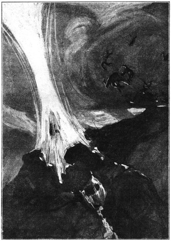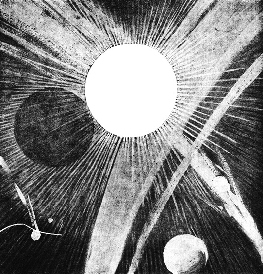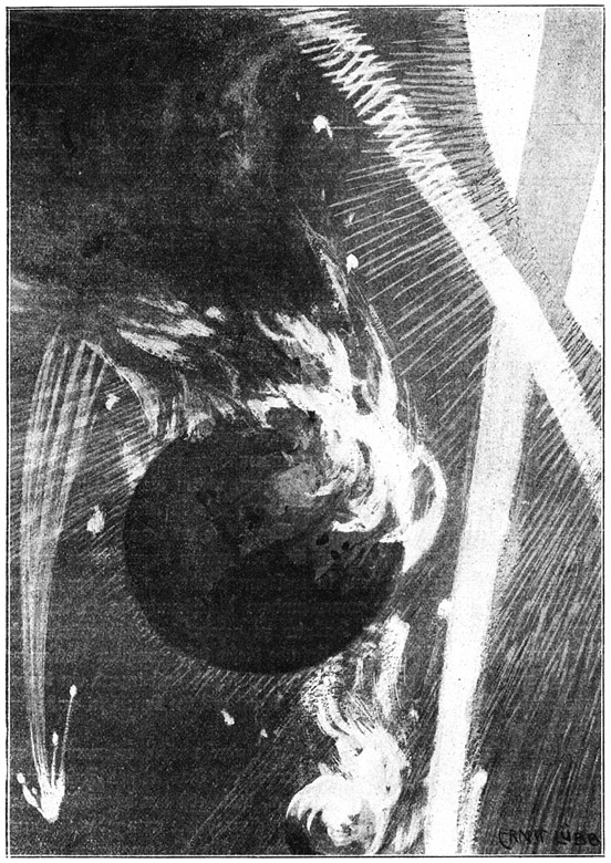 Es unterliegt wohl kaum einem Zweifel, daß die Sonne von unserem Sonnensystem die erste wäre, die den Zusammenstoß mit dem fremden Weltkörper erhalten müßte. Das kommt daher, daß das ganze System nicht staffelweise, sondern flach durch den Raum eilt; und infolgedessen würde sein Zentrum als der förmliche Brennpunkt der gesamten Anziehungskraft zuerst dem selbst mitangezogenen fremden Körper entgegengeschleudert werden. Dieser Körper würde, soweit wir die toten Sterne bisher berechnen können, die Sonne an Massigkeit weit überragen oder ihr zum mindesten gleich sein. Wenn sie nun mit einer Geschwindigkeit von vielen hundert Meilen in der Sekunde aufeinander zustürzen würden, dann würde er in der furchtbaren Hitze, die sich dadurch allein schon entwickeln würde, schmelzen wie Wachs. Wir selbst und all die anderen Planeten würden in ein Feuerbad gestürzt werden, das eine Temperatur von einer Million Grade haben würde. Einen Augenblick, bevor diese Hitzewelle uns treffen würde, würden unsere Städte, unsere Hügel und Berge gegen den Himmel emporragen, und einen Augenblick später werden sie nichts anderes als ein Meer von Dunst und Dampf sein.