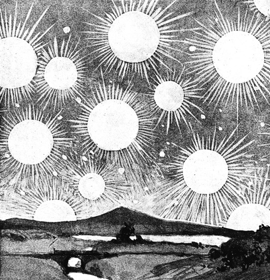 Es kann mathematisch nachgewiesen werden, daß in der Mitte dieses Nebels ewiges Tageslicht herrscht, und es wäre ganz gleichgültig, ob die Erde auch weiterhin noch so wie jetzt sich um ihre Achse drehen würde, so daß die Sonne für sie scheinbar aufgeht und sinkt; denn es würde doch auf allen Seiten der Erde das Licht der andern Tausende von Sternen erstrahlen, so daß wir das Sonnenlicht nicht brauchen. Natürlich würden unter diesem Einflüsse von Licht und Wärme alle Lebensbedingungen andere werden. Alles wäre in Bewegung. Immerfort würde sich der Wechsel in der Lage der vielen Sonnen uns gegenüber bemerkbar machen. Unsere eigene Sonne würde in eine Bahn von unglaublicher Kompliziertheit gedrängt werden, und die Erde würde immer hinter ihr her oder vielmehr um sie herum jagen. Bald würde sie sich dem Mittelpunkt des Nebels nähern, bald wieder an der Peripherie desselben hinausgehen, und immerwährend würde sich der Anblick des Himmels, der Intensität des Lichtes und die Intensität der Wärme ändern. Der Himmel wäre wie ein Kaleidoskop, das in immerwährender Drehung befindlich ist, und immer neue und wunderbare Kombinationen strahlender Lichteffekte bieten würde. Es ist aber auch möglich, daß unter dem Widerstreit so vieler verschiedener Anziehungskräfte unsere Erde der Kontrolle ihrer Sonne einfach entzogen und unter die Herrschaft einer anderen kommen würde. Und das kann immer und immer wieder geschehen, so daß im Laufe der Zeit unser Planet der Gravitationssklave der verschiedenen Sonnen werden könnte, und mit jedem Wechsel der Herrschaft würde auch ein Wechsel der auf unsere Erde wirkenden Sonneneinflüsse stattfinden, und damit würden sich immer aufs neue wieder alle Lebensbedingungen und Lebensverhältnisse ändern. Jede andere Sonne in dem Sternenbild des Herkules mag ihre besonderen Strahlungseigentümlichkeiten haben, und die lebenden Wesen auf unserer Erde würden ihnen immerfort ausgesetzt sein. Der Magnetismus der einen Sonne dürfte ein anderer sein, als der der zweiten und dritten, die Lichtart und Wärme stets eine andere, und die Erde müßte sich, wenn sie von einer Sonne zur andern geht, in immer neue Verhältnisse finden; ungefähr so, wie wenn eine Frau der Reihe nach Männer von anderem Charakter und anderem Temperament nähme; der eine heiß, glühend und leidenschaftlich, der andere kalt, ernst und gleichgültig, ein anderer reizbar und nervös, ein vierter launenhaft und abstoßend. Und die Erde würde all das auch in ihrem Wesen und ihrer Erscheinung wiederspiegeln; denn so wie das Weib das ist, wozu der Mann es erst gemacht, so ist auch ein Planet nur das, wozu die Sonne ihn macht.