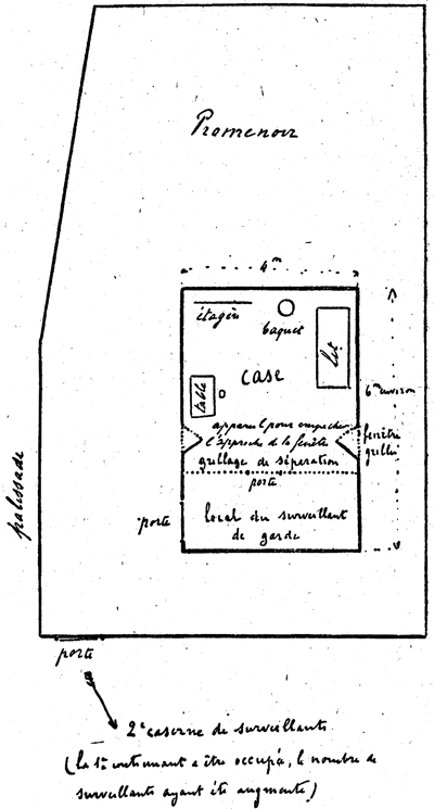 In der von der Pallisade ( palissade) nach Westen begrenzten Umzäunung befindet sich mein Spazierplatz ( promenoir) und meine Zelle ( case) nebst der Wachtstube ( local des surveillants). In meiner Zelle steht oben links das Regal ( étagère), dann folgt die Toilette ( baquet), an der rechten Wand das Bett ( lit) und das eine vergitterte Fenster ( fenêtre grillée) mit der Einrichtung, die mir die Annäherung an dasselbe unmöglich machen sollte. Dann folgt unten das Gitter ( grillage de séparation) zwischen meiner Zelle und der Wachtstube mit einer Thür ( porte), hierauf links das 2. Fenster und der Tisch ( table). Die Wachtstube hat eine Thür nach Westen, und die Thüre im Südwesten der Umzäunung führt nach der zweiten Caserne der Wärter (die erste war besetzt, da die Zahl der Wärter sich vergrößert hatte.)