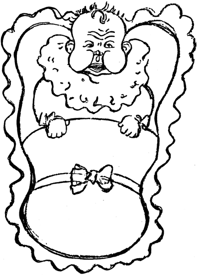 Schuft schnappte gerade nach einer Fliege, die sich bis unter das Sofa verirrt hatte und versäumte somit den denkwürdigen Augenblick. Er schien sich aber darüber zu trösten, denn er tappste langsam und schweifwedelnd an Frau Meyer heran, die jetzt mitten im Wohnzimmer stand und in einem weißen Bündel Wäsche ein rotes Stückchen Menschenfleisch dem versammelten Publico entgegenhielt. Der glückliche Vater und die noch glücklichere Tante beschauten dieses Stückchen Zeitgenosse neugierig von allen Seiten und Minna konnte sich nicht enthalten, sofort eine riesenhafte Ähnlichkeit mit seinem Papa zu konstatieren. Und wirklich schien aus diesen Runzeln und aus diesem gesottenen Krebsgesicht die erbliche Apothekerschwerenöterei herauszublicken, denn plötzlich hörte das Brüllen auf und zwei graublaue Äuglein guckten in die neue Welt hinein, die ihnen bisher noch unbekannt war. Schuft hatte sich inzwischen auf die Hinterbeine gestellt und versuchte auf seine Weise mit dem Neuangekommenen Bekanntschaft zu machen, indem er das Wäschebündel mit der Nase beroch.