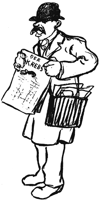 Das ganze Kaffeehaus sprach eine Zeitlang von nichts weiter als von dem »Krebs« und Fritz hatte alle seine alten Beziehungen herausgesucht, um Inserate aufzunehmen. Die ersten beiden Nummern der Zeitschrift waren erschienen, an den Säulen klebte ein grünes Plakat mit einem roten Krebs darauf gemalt und mit weithin leuchtenden Buchstaben; »Heute neue Nummer«. Die Auflage wurde sogar gekauft, denn das Großstadtpublikum ist immer neugierig und Neuerscheinungen gegenüber sehr empfänglich. Der Krebs war eigentlich in der Tendenz