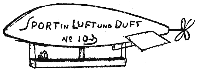 Es wäre nun alles wirklich recht schön und gut gewesen, wenn nicht plötzlich Leute auf die Idee gekommen wären, das lenkbare Luftschiff zu erfinden, und wenn diese Erfindung nicht so glänzend ausgefallen wäre, daß sie innerhalb ganz kurzer Zeit alle anderen Vehikel von der Erde verdrängte. Was nützte es nun Fritz, daß er ein hundertunddreißigpferdiges Automobil besaß, wenn ihn sein Konkurrent, der die neue Zeitung »Sport in Luft und Duft« herausgab, mit einem Luxus-Luftschiff überholte. –1 Aber Söröny kam eines Tages mit einem dunklen Herrrn in das fürstlich eingerichtete Arbeitszimmer des Herrn Generaldirektors, und es entspann sich folgende Unterhaltung zwischen den drei Gentlemen, unterbrochen durch das sprudelnde Spucken des kleinen Ungarn.