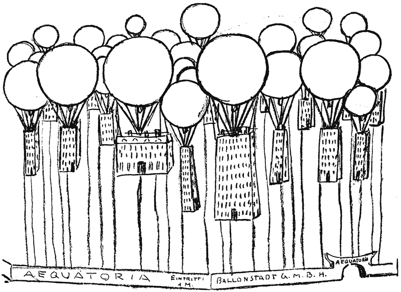 Genendelsohn verwaltete in seiner bekannten Art den ganzen Betrieb. Jeden Abend fuhr er auf einem kleinen Aeroplan durch die Luft und revidierte die einzelnen Ballonhotels, nahm das bar eingenommene Geld mit und machte dann unten auf der Erde die gleiche Runde in den Aluminiumbaracken, wenn alles sich um ein Uhr nachts zur Ruhe begeben hatte, setzte er sich auf seinen Klubsessel im Privatkontor, der auf einem besonderen Kühlapparat stand und ließ sich mit der Börse in Berlin telephonisch verbinden. Denn in Berlin war es gerade ein Uhr mittags, wenn es in Aequatoria ein Uhr nachts schlug. Die Ringbahn um die Erde (Fritzens Patent) war nämlich noch nicht negoziiert und Genendelsohn arbeitete daran, die ganze Sache in Form einer Aktiengesellschaft zu gründen.