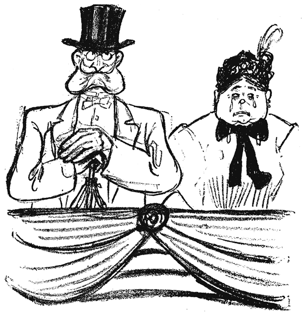 Und als Fritz einmal bei einer besonders schwunghaften Phrase eine Bewegung machte, die ihm beinahe das Gleichgewicht gekostet hätte – er mußte nämlich das Monokel fester klemmen – schrie Mama Krohn laut auf, so daß alle nach ihr hinsahen und den Kopf schüttelten über die alte Dame, deren Tränen über die Backen kullerten. Mama Krohn aber nahm sich zusammen und strich das seidene Kleid zurecht, das sie bei der Aufregung ein bißchen zerknittert hatte. Papa Krohn blinzelte aus seinen weltverständigen Augen seinen Sohn an und war stolz auf die vererbten Eigenschaften.