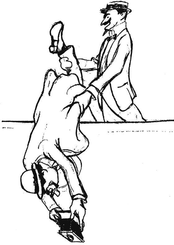 Um eine ganz gewissenhafte Schilderung zu geben, dürfen wir nicht vergessen noch zu erwähnen, daß bei der Riesenschlangenpanne der Berichterstatter des »Anzeigers« beinahe ertrunken wäre, da er sich mit dem ihn besonders auszeichnenden Wagemut zu weit über die Balustrade lehnte, um eine photographische Aufnahme zu machen, und dabei in den Ozean gefallen wäre, wenn ihn nicht sein Kollege vom Petit Parisien hinten am Rockzipfel festgehalten hätte. So weit ging die Kollegialität der Presse, die neidlos einander das Leben rettete. Man ersieht daraus, wie großes gemeinsames Glück die Menschen einander näher bringt, genau so wie gemeinsames Unglück.