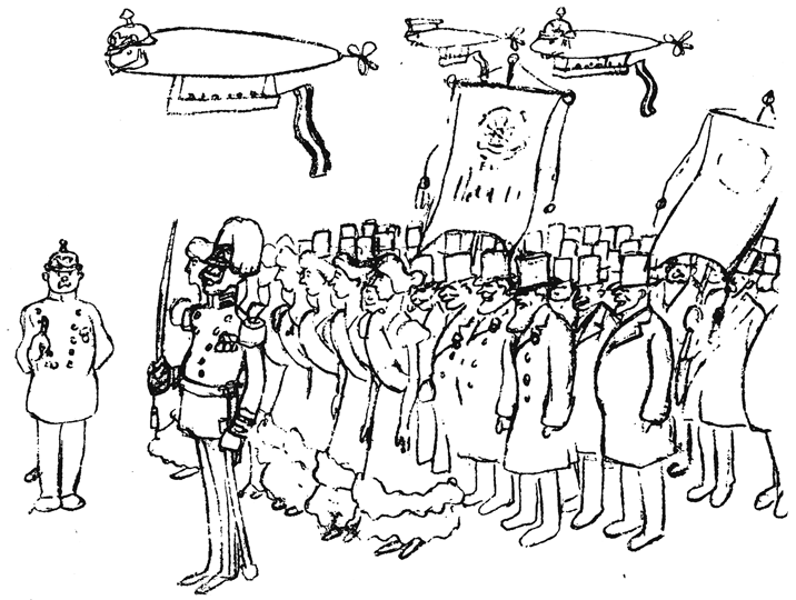 Eine Viertelstunde später leuchteten die Lichter von Berlin auf. Hier hatte Fritz einen längeren Aufenthalt vorgesehen. Unter den Linden standen zehn Regimenter Soldaten stramm und schrien Hurra, während vom Tempelhofer Feld Kanonendonner dröhnte. Hunderte von Militärmotorluftschiffen kreuzten um den Glaszug und ihre Führer manövrierten »rechts um« und »links um«.