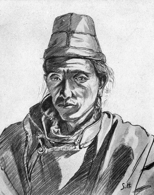 Ein anderer, an den ich mit großer Sympathie und Freundschaft zurückdenke, hieß Schukkur Ali. Ich kannte ihn seit 1890 von Kaschgar her, wo er in Younghusbands Diensten stand, und ebenso wie ich wußte er noch, daß ich ihn einmal im Zelte seines Herrn gezeichnet hatte. Er war derartig und zwar ganz unfreiwillig komisch, daß man schon vor Lachen ersticken konnte, wenn er nur den Mund öffnete; unter dieser Schar mehr oder weniger erprobter Asiaten war er mein ältester Bekannter. Er hatte 1896 an Wellbys Reise teilgenommen und machte uns die unheimlichsten Beschreibungen von den Leiden, die der im Burenkriege gefallene Hauptmann mit seiner Karawane in Nordtibet habe ausstehen müssen, als aller Proviant verzehrt und alle Tiere verendet waren. Ein Jahr später nahm er an meinen Bootfahrten über den heiligen See Manasarowar teil und war mir dort ebenso nützlich, wie er mich erheiterte. Schukkur Ali war eine ehrliche Haut, ein wackerer Kerl, der ungeheißen seine Arbeit tat, sich nie mit jemand zankte und zu jedem Dienste willig und bereit war. Immer war er strahlend heiterer Laune, selbst während des heftigsten Sturmes mitten auf dem See, und nur zweimal sah ich ihn weinen wie ein Kind: am Grabe Muhamed Isas und in der Stunde, als wir uns Lebewohl sagten.