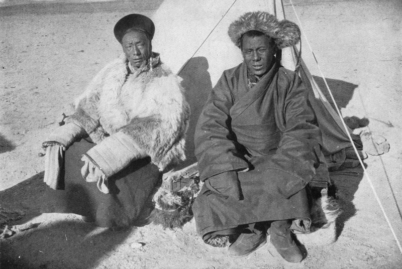 Begleitet von Robert und Muhamed Isa machte ich um drei Uhr meinen Gegenbesuch. Hladsche Tserings Zelt war groß und hübsch eingerichtet, und alle seine Sekretäre und Diener (Abb. 94) saßen um das Feuer herum, das hoch nach der oberen Zeltöffnung hinaufloderte. An den Zeltwänden lagen Säcke Reis und Tsamba und mehrere unzerlegte geschlachtete Schafe; alles sah aus, als habe der Alte sich auf längeres Verweilen eingerichtet. Gewehre mit Gabeln und Fähnchen, Säbel und Lanzen, Geschirr, Zügel, Sättel und Satteldecken; alles ließ dieses Häuptlingszelt malerisch und kriegerisch erscheinen. An der kurzen Wand, dem Eingang gegenüber, waren hohe Kissen aufgestapelt, die mit kleinen Teppichen aus Lhasa bedeckt waren und auf denen runde Kissen als Rückenlehne standen. Hier wurde ich aufgefordert, neben Hladsche Tsering Platz zu nehmen; vor uns wurde ein kleiner roter, lackierter Tisch gestellt. Zu unserer Rechten stand ein Altarschrein mit vergoldeten Götterstatuen und »Gaos« – kleinen, silbernen Futteralen mit Buddhabildern, die man, wenn man reist, an einem roten Riemen über der Schulter trägt. Vor ihnen flackerten die Butterdochte in glänzenden Messingschalen.