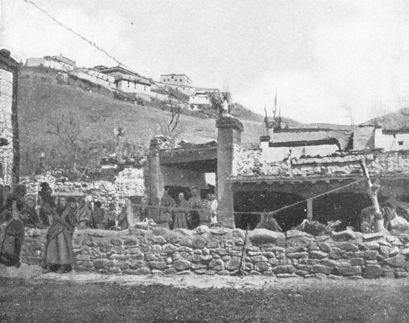So steigen wir denn nach dem Gipfel des Hügels hinauf, wo mehrere weiße Klostergebäude liegen und werden von einer ganzen Bande böser Hunde empfangen. Der Haupttempelsaal, Dokang-tschummo, ist nach demselben Plan erbaut wie der untere, und reich an Bildsäulen, von denen einige mit Binden und Silberfutteralen dicht behängt sind. Wir werden von einem Heiligtum in das andere geführt und staunen über die außergewöhnlich fein gearbeiteten Fresken, die alle Wände bedecken. Ein hoch gelegener Göttersaal ist von einem ungedeckten Gang mit Geländer und Gebetzylindern umgeben; ringsumher aber breitet sich ein großartiges Panorama wilder, zerklüfteter Berge aus.