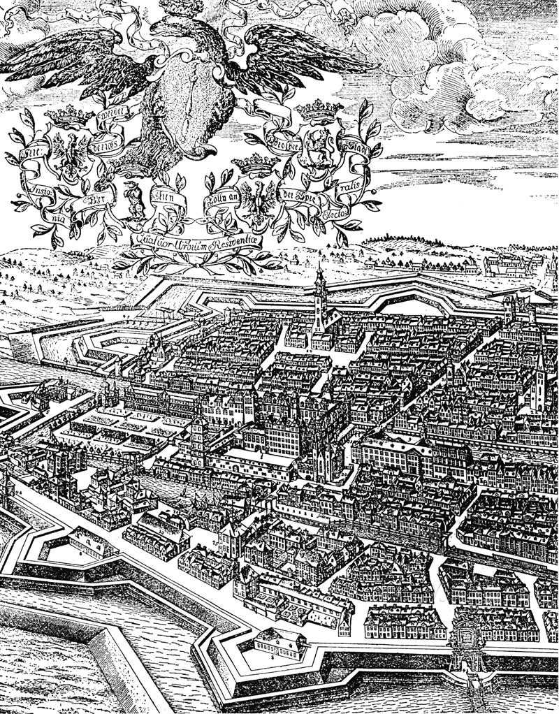 Verkleinerter Ausschnitt aus dem Bild Berlins, gezeichnet 1688 von J. B. Schultz (vgl. S. 37)