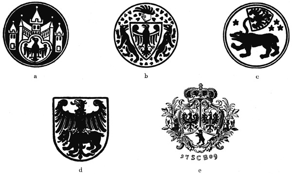 Das Wappen a stammt aus dem 13. Jahrhundert, b ist das meistgebrauchte unter den ältesten Wappen der Stadt: der Reichsadler, beschützt von den Berliner Bären. Das Wappen c aus dem 14. Jahrhundert ist an die Unterwerfungs-Urkunde von 1448 angeheftet, mit der die Hohenzollern der Stadt Berlin den Verlust der Freiheit bescheinigten. Dieses Wappen, auf dem der Berliner Bär den Adler an einem Strick mit sich zieht oder von ihm gezogen werden soll, ist schon vor der Unterwerfung Berlins verwendet worden. Das Siegel mit dem Adler auf dem Rücken des Bären (d) vom 15. Jahrhundert wurde bis 1709 als großberlinisches Ratssiegel gebraucht. Nach der Vereinigung der vier Residenzstädte durch den ersten König wurde im neuen Wappen der Einheitsgemeinde dem Bären zwar wieder seine aufrechte Haltung zurückgegeben, doch verwandelte er sich dabei in ein machtloses Hündchen, das unter der Last von zwei übergroßen Adlern, dem brandenburgischen und dem preußischen, erdrückt wurde. Dieses Wappen ist als e abgebildet. Der Reichsadler des alten Wappens war verschwunden. Hoffentlich kehrt Berlin, nachdem die Schäden der kleinen Einzelstaaterei erkannt sind und Berlin allmählich zur Hauptstadt des Reiches wird, zu seinem alten Wappen zurück, das den Reichsadler im Schutze gutgewachsener hauptstädtischer Bären zeigt.