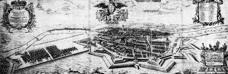 Berlin beim Tode des »Großen« Kurfürsten (1688) kurz vor dem Abbruch der neuen Festungswerke. Gezeichnet von Johann Bernhard Schultz. Links die neue Dorotheenstadt mit den Linden. (Von der Mitte des Bildes mit dem Schloß befindet sich ein Ausschnitt auf Seite 27)