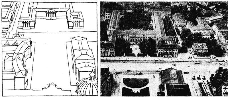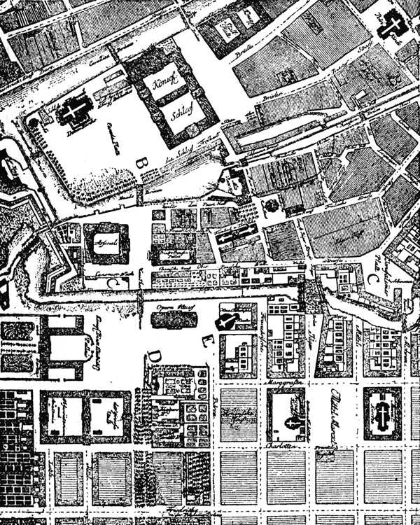 Friedrichs-Forum, wie es ursprünglich symmetrisch geplant war: die (heutige) Universität war nach Norden (links) geschoben. Nach dem Schmettauschen Plan in seinem ältesten Zustand (Besitzer: Werner Hegemann). Seite 111 zeigt den späteren Zustand.