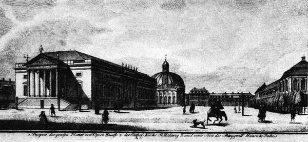 Das Berliner Opernhaus, wie Knobelsdorff es geplant und nach dem Schmettauschen Plan (S. 111) ausgeführt hat. Opernhaus und Kirche gewannen durch die niedrigen Bauten der Nachbarschaft
