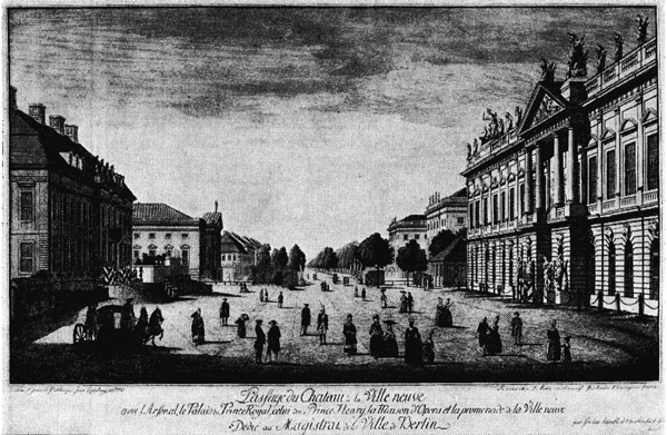 Der ursprüngliche Entwurf für das Friedrichs-Forum zeigte, wie die Straße Unter den Linden etwa durch die Mitte der großen quer gestellten Platzanlage führen sollte (vgl. Plan auf Seite 130). Erst die späteren Abzüge des großen Schmettauschen Planes von Berlin zeigen die Anordnung der Bauten, wie sie später zur Ausführung kam (Seite 111). Die heutige Universität wurde dabei näher an Unter den Linden herangeschoben. Aber was der Platz durch diese Verschiebung an Symmetrie verlor, gewann er an festerem Zusammenhang. Die Beziehung zwischen dem Vorhof der Universität und der Platzhälfte westlich der Oper wurde klarer. Auf einem Rundbild des großen Schmettauschen Stadtplanes kann man sehen, mit welchem ruhigen und niedrigen Abschluß des Platzes im Süden und Westen Knobelsdorff rechnete (Seite 131). Durch diese niedrigen Bauten kamen das Opernhaus und die eigenartig über Eck stehende Hedwigskirche (deren Säulenvorhalle gleichzeitig als Abschluß der Behrenstraße gedacht ist) kräftig zur Geltung.