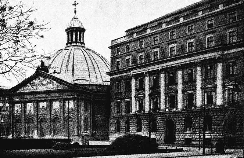 Als Wilhelm II. bald darauf Berlin endgültig verlassen hatte, versuchten seine Nachfolger, seine Entweihung des Friedrichs-Forums noch weiter zu überbieten. Zuerst errichteten sie statt der früher taktvollen, bereits verdorbenen, aber wenigstens noch nicht übermäßig hohen Bauten auf der Südseite des Platzes ein hohes Bankgebäude, welches der Hedwigskirche nicht nur durch seine Höhe, sondern auch durch seine aufdringliche hochgestellte Säulenordnung noch mehr schadet, als es der bedauerliche Schnürbodenaufbau auf dem Opernhaus zu tun vermag (Seite 131, 135). Dann ersetzten sie diesen Schnürbodenaufbau, von dem die wilhelminischen Bauherren wenigstens versprochen hatten, er solle wieder verschwinden, durch eine hohe und für alle Zeiten bestimmte Konstruktion. Auch damit nicht zufrieden, zerrissen sie die glatten östlichen und westlichen Seitenwände des Opernhauses durch große Vorbauten. Namentlich der westliche Vorbau schadet dem Friedrichs-Forum, denn er stellt sich vor die Hedwigskirche, die bereits von rechts und links durch überhohe Bauten gedrückt und künftig durch den Vorbau am Opernhaus noch hoffnungsloser in die Ecke gedrängt wird.