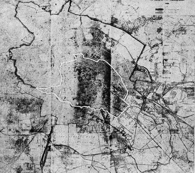 Die weiße Linie zeigt das verstümmelte Klein-Berlin von 1808, die viel umfassendere dunkle Linie das mittelalterliche Weichbild, das nur langsam wieder erreicht und bis 1920 festgehalten wurde