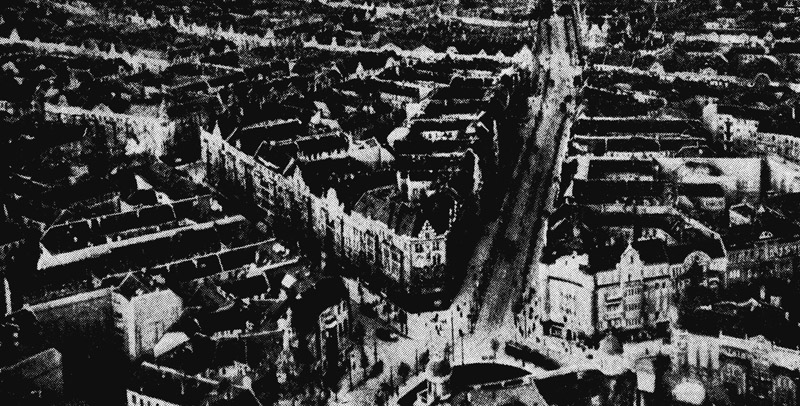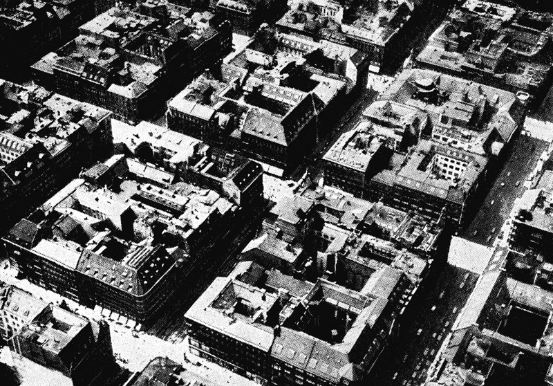 Friedrichstadt. Die Leipziger Straße zieht durch die Mitte des Bildes vom unteren Rand links zum oberen Rand rechts; die Friedrichstraße von der Mitte des rechten Randes (oben) zum oberen Rand (links). Obgleich diese Geschäftshaus-Blocks schon so eng und hoch gebaut wurden, daß viele ihrer Höfe zu ewiger Dunkelheit verdammt sind, erlaubt die Bauordnung von 1925 noch eine wesentliche Steigerung der Bauhöhe und weitere Verdunkelung der Höfe, an denen Tausende von Menschen ihr Leben lang unter ungesunden Verhältnissen arbeiten müssen