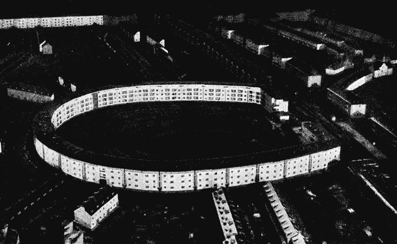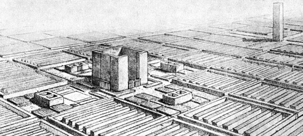 Schema der besten Belichtbarkeit und höchsten Ausnutzbarkeit eines Geschäftsviertels. Das Bild zeigt, daß Turmhäuser keine gesteigerte Ausnutzbarkeit bedeuten, weil sie, um selbst gut beleuchtet und kein Sonnenschirm für benachbarte Häuser zu sein, von großen Flächen unbebauten Landes umgeben sein müssen. (Aus Werner Hegemann: »Kritik des Großstadt-Sanierungs-Planes Le Corbusiers«, der die gedrängtesten Geschäftsviertel von Paris durch Turmhausbau sanieren zu können glaubt. Vgl. »Städtebau« 1927, S. 69)