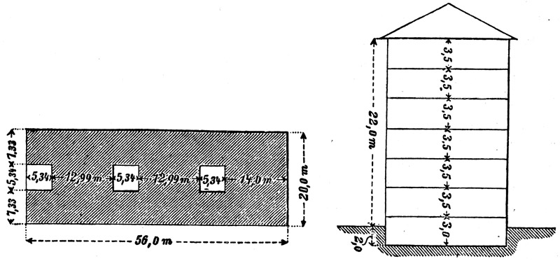 Grundriß und Querschnitt eines typischen Berliner Hauses (mit 20 m Straßenfront und 3 Höfen von je 5,34 m im Quadrat), wie es nach der von 1853 bis 1887 geltenden, vom preußischen Staat verfaßten Berliner Bauordnung gebaut wurde. In sieben bewohnbaren Geschossen konnten (bei 1,5 bis 3 Personen in jedem Zimmer von 15 bis 30 qm und ohne Belegung der Küchen) 325 bis 650 Menschen untergebracht werden. Die beiden 56 m langen Seitenwände sind natürlich fensterlose Brandmauern. (In der Ackerstraße 132 wohnten lange über 1000 Menschen.)
