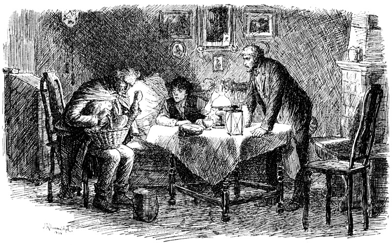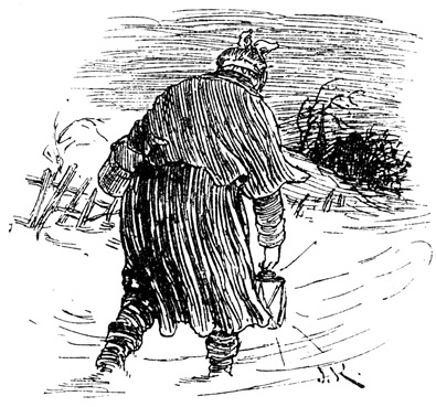 »So, so – kann sein,« brummte Sievert. Damit schien er jede weitere Erörterung abschneiden zu wollen. Er schlug seinen Mantel zurück, und der Anblick, den er jetzt darbot, machte den Studenten hell auflachen. Am rechten Arm hing ihm ein Henkeltopf aus weißem Blech, daneben ein Weidenkorb, in welchem ein Brot lag; an einem seiner Rockknöpfe baumelte ein Bündel Unschlittkerzen, und aus der Brusttasche guckte der Glasstöpsel eines Rumfläschchens im Verein mit einer gefüllten Papiertüte.