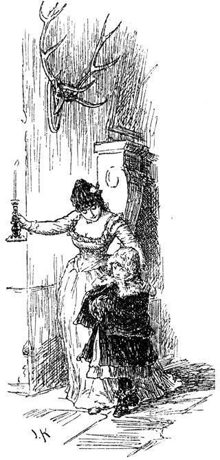 Jutta trat rasch in das Bereich der Thür. Sie hielt die Hand schützend vor das flackernde Kerzenlicht; dadurch wurde der Strahl desselben doppelt kräftig auf das Gesicht und die Büste des jungen Mädchens geworfen, und wie sie so dastand, den blumengeschmückten Lockenkopf mit dem Ausdruck lächelnder Spannung vorgeneigt, während der Flammenschein des Kamins hinter ihr aufzuckte und die Bilder und Hirschköpfe als nebelhafte, fremdartige Gestalten von den Wänden herabdämmerten – da mußten wohl die in Sturm und Nacht draußen Stehenden unwillkürlich an eine jener wunderholden Erscheinungen denken, wie sie das Märchen in alten verzauberten Schlössern walten und weben läßt.