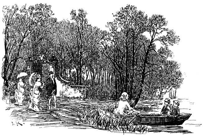 »Nun, mein Kind, das ist ja eine ganz merkwürdige Situation, in der wir uns wiedersehen!« rief der Herr scharf hinüber, als der Kahn näher kam. »Tausend noch einmal, was für edle Passagiere fährst du! … Ich fürchte nur, sie werden ebenso leicht, wie du selbst, vergessen, wer am Ruder sitzt!«