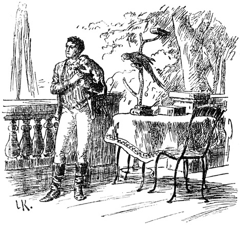 Er schalt den Papagei und klopfte ihn mit einem silbernen Löffel auf den Rücken, worauf sich das Tier schreiend aus dem Staube machte und schleunigst auf seinen Ring zurückkletterte. Der alte Soldat räumte das Geschirr zusammen, nahm einige auf den Stühlen umherliegende aufgeschlagene Bücher, um sie sorgfältig auf dem Tisch zu ordnen, rückte einen Cigarrenkasten daneben und trat dann, die Platte mit dem Silber auf dem Arm, in die Halle zurück.