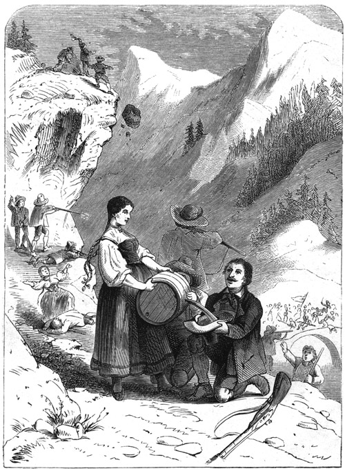 Jetzt habt Ihr genug getrunken, nun geht wieder hin in den Kampf für's Vaterland, sagte sie dann, und winkt zwei andere Schützen herbei, sich an ihrem Faß zu erlaben. Die jungen Männer aber springen von dannen, und sie wissen selber nicht, ist es der Wein, oder ist es der Anblick der lieblichen Tyrolerin, der sie mit Begeisterung und Muth durchglüht.