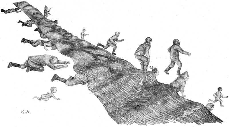 Endlich erreichten sie die Grenze zwischen dem Meer und dem Land unter dem Meere, die von einem schäumenden Bach gebildet wurde; um hinüberzugelangen, mußten sie über große, spitze Steine springen, die ganz von nassen Tanggewächsen bedeckt waren und so glatt schimmerten, daß niemand sich hinüberwagte. Ajarqissaq aber, der sich nie fürchtete, sprang zuerst, kam glücklich hinüber und rief die anderen. Alle Hilfsgeister folgten ihm, schließlich blieb nur Avggo zurück, der den Sprung nicht wagte, weil er fürchtete, auszugleiten und von dem schäumenden Bach davongewirbelt zu werden. Als Ajarqissaq sah, wie er zögerte, rief er zu ihm hinüber: