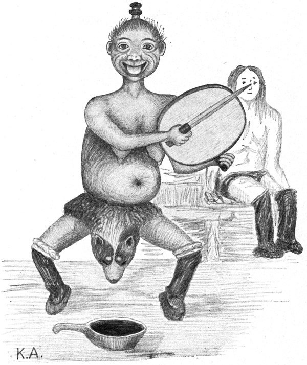 »Das ist mir recht,« sagte der Mondmann plötzlich besänftigt und freute sich. Der Geisterbeschwörer und seine Hilfsgeister gingen gleich an die Arbeit. In Haufen lag überall der Schmutz; als sie ihn aber zusammenfegten und hinauswarfen, verwandelte er sich in Fangtiere: Seehunde, Narwale, Bären, Füchse und Vögel. Auf diese Weise sandte der Geisterbeschwörer eine Menge Fangtiere zu seinem Wohnplatz hinab.