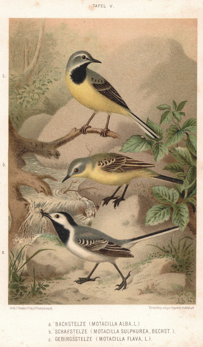 Regungslos liegt der Wasserspiegel vor uns, umgoldet von den Stralen der Frühsommersonne. Soweit unsere Blicke schweifen, sehen wir jetzt, in der schon recht heißen Mittagsstunde, kein lebendes Wesen. Erst bei näherer Betrachtung wird die einförmige Ruhe, die uns fast als Ode dünkt, angenehm unterbrochen, denn dicht am Wasser laufen mehrere Bachstelzen hin und her. Bei unserm Nahen zeigen sie sich durchaus nicht scheu, sondern trippeln unbekümmert um uns, kopfnickend und schwanzwippend zierlich und ungemein flink, neben uns durch's flache Wasser. Dann kommt noch eine herzu, weit her, im leichten, bogenlinigen Fluge, indem sie beim Setzen den Schwanz spreizt und ihn hastig auf und nieder wippt. Jetzt necken und jagen sie einander unter scharfem sit, sit, zissi, zissi, zissi, und muthwillig auch die Sperlinge und andere Vögel, welche zum Trinken hierher kommen. So erfreut sich an ihnen Jedermann und der Volksmund hat ihnen zahlreiche Namen beigelegt: blaue, gemeine, graue und weiße Bachstelze, Ackermännchen, Kloster- und Stiftsfräulein, Klosternonne, Haus-, Quick-, Stein-, Wackel-, Wasser-, Wege- und Wippstelze, Wippstelz oder -Sterz, Wieb- oder Wipp-Sterten, Wippstürt, Bebe-, Wedel- und Wippschwanz, Wackelschwanz.