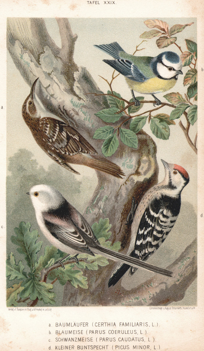 Am Herbstmorgen wandern wir hinaus. Noch hüllt dichter Nebel alles rings um uns her in sein ödes Grau und wir vermögen kaum einige Schritte weit uns umzublicken. Während wir so den schmalen Weg, der sich zwischen Wiesen und Auen, Äckern, Gebüsch und einzelnen hohen Bäumen hinschlängelt, einsam entlang wandeln, hören wir förmlich geheimnißvolle Stimmen der Vögel des Herbstes, die wir doch keineswegs sehen können. Es ist noch frühe und zuerst vernehmen wir das pfeifende Schwirren des vom fernen Bruch her nach dem drüben liegenden See zurückkehrenden Flugs wilder Enten, die hoch über uns dahinstreichen. Dann läßt eine durch unser Nahen von der Pappel aufgescheuchte Nebelkrähe ihr schwart, schwart erschallen und in den nächsten Gebüschen rings um uns her wispern zahlreiche Vögel. Vor und hinter uns hören wir sie, ohne sie zu sehen und dicht neben uns ertönt ihr sit, sit, hä, hä, hä, zirrhüt, gleich als wollten sie uns necken. Dann bricht die Sonne durch das Gewölk und ihre Stralen durchdringen und rollen den Nebel förmlich auf. Der erste Vogel aber, den wir jetzt erblicken, umgoldet von den Sonnenstralen, die in den Tropfen rings an den Zweigen erglitzern und erfunkeln, ist eine Haubenmeise, welche hier nicht allein förmlich wunderbar schön erscheint, sondern auch mit ihren komischen Geberden, die Tolle auf- und niederklappend und auf einem kahlen Zweige sich hin- und herdrehend, uns einen lieblichen Anblick gewährt. Dazu läßt sie ihren leisen, wie klirrend ertönenden, freilich für den Kenner nur als unbedeutend geltenden Gesang eifrig hören. Bei näherer Betrachtung erscheint sie als ein schlicht-, doch hübsch gefärbter Vogel: