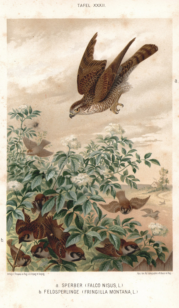 Während wir am weiten Ausblick bis nach den fernsten Punkten des Horizonts hin, welche die klare, durchsichtige Herbstluft wahrnehmbar bis in's Einzelne hervortreten läßt, uns erfreuen, achten wir wenig auf das Leben und Weben in unsrer nächsten Umgebung; aber mit einmal wird unsre Aufmerksamkeit in Anspruch genommen, durch einen förmlich dramatischen Naturvorgang, welcher sich vor unseren Blicken abspielt. In den schon herbstlich kahl und fahl werdenden Hecken, neben dem noch ungemäht dastehenden Haferstück, treibt sich ein Schwarm Feldsperlinge lustig umher; sie haben sich in dieser Zeit so satt und voll gefressen, daß sie es nicht der Mühe für werth halten, wie sonst weite Ausflüge zu machen; was können sie beßres haben, als dicht vor ihrem Schnabel die süßen, noch nicht vollreifen Haferkörner. Vor der Hecke aber im lichten Gezweige tummelt sich eine kleine Schar absonderlich schöner Vögel, welche unsere Blicke viel mehr fesseln, als die Spatzen. Gewandt kletternd, schnurrend fliegend und hüpfend durchstreifen sie, die Schwanzmeisen, jetzt täglich ihren bestimmten Bezirk, emsig Gesträuch und Kraut nach Kerbthieren absuchend. Sie zerhacken die Beute nicht, wie die anderen Meisen, sondern fressen nur zarte weiche Kerbthiere und deren Bruten. Gerade aber während sie hier vorüberziehen und ihre Locktöne zit, zit, hochpfeifend tihit und hellklingend ziri, ziri und sodann auch ihren leise zirpenden und sanft klagenden, unbedeutenden Gesang lauten lassen, streicht plötzlich um die Ecke des dichten Gehölzes ein Sperber hervor (s. Tafel XXXII). Er hat es nur abgesehen auf einen der fetten Spatzen, aber die Meisen stürzen sich mit schrillem Geschrei in's dichteste Gebüsch und ducken sich hier in tödtlichster Angst in irgendwelche Verstecke. Während der Raubvogel längst mit seiner Beute abgezogen ist, hocken sie noch immer im Dickicht, bebend vor der Gefahr, dann allmälig erholen sie sich und kommen wieder zum Vorschein. Nun können wir sie in all' ihrer Schönheit, in ihrem sanften, nicht kecken Wesen, verträglich gegen andere Vögel und harmlos zutraulich, aber niemals dreist und keck dem Menschen gegenüber, beobachten.