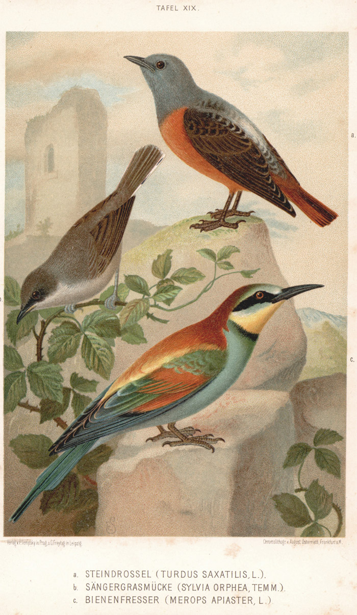 Im Sprachgebrauch und von den Liebhabern werden zwei Vogelarten als Drosseln mitgezählt, welche man sonst in der Regel als Felsschmätzer ( Petrocincla, Vyrs.) bezeichnet. Hier, in der, wenn auch wissenschaftlichen, so doch vor allem volksthümlichen Schilderung unserer einheimischen Vögel, will ich sie ohne weitres als Drosseln gelten lassen. Beide sind vorzugsweise in Südeuropa heimisch und kommen nur in den südlicheren Theilen, die eine sogar blos in engbegrenzten Strichen in Deutschland vor. Dennoch dürfen wir sie hier nicht übergehen – schon um ihrer außerordentlichen Beliebtheit als Stubenvögel willen. Sie werden alljährlich zu Hunderten bei uns in den Vogelhandel gebracht.