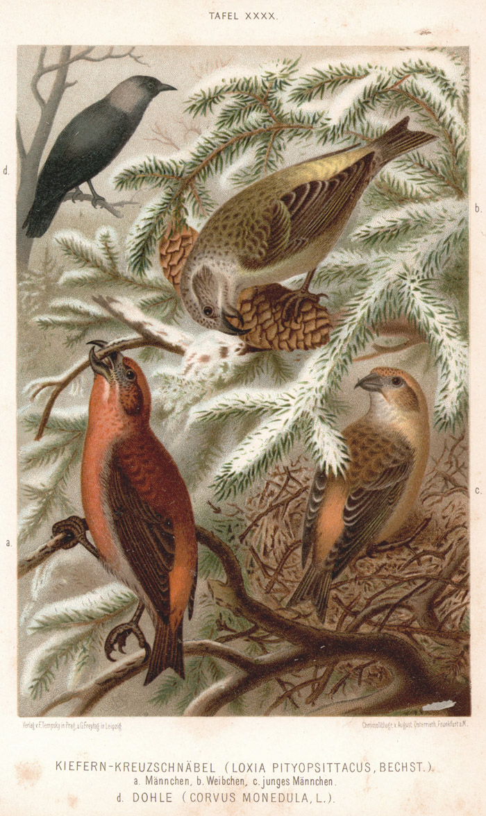 Kiefernkreuzschnäbel (Loxia pityopsittacus, Bechst.),