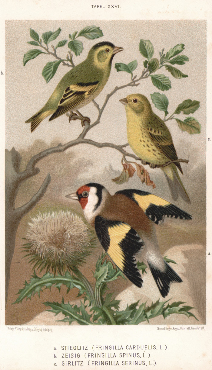 Wer Sinn für Naturschönheit und Zuneigung für die Vögel hat, muß sich freuen an dem muntern und liebenswürdigen Wesen des Stiglitz; leicht in Wellenlinien fliegt er dahin, klettert geschickt in den Zweigen und hängt sich meisenähnlich an, während er freilich auf dem Boden nicht recht gewandt hüpft. Immer sauber und zierlich im Gefieder sitzt er gewöhnlich auf den höchsten freien Zweigen von Birken, Erlen, Pappeln u. a.; keck und muthwillig, neckt er sich gern mit seinesgleichen und anderen Vögeln umher. Ganz Europa bis zur Mitte Schwedens nordwärts, auch Asien und Sibirien, Afrika und die kanarischen Inseln bilden seine Heimat. Hier ist er fast überall, insbesondre in Obstgärten, Hainen, Feldhölzern, Vorwäldern der Gebirge, niemals aber im reinen Nadelholzwald und im alten Hochwald zu finden. An den ersterwähnten Orten steht auch das Nest im Mai auf Obst-, Weg- und Waldbäumen, etwa 2 bis 16 Meter hoch, immer im dichtesten Gipfel, aus Halmen, Würzelchen, Fasern und Fäden mit Mos und Flechten kunstvoll und fest gewebt und mit Kerbthiergespinnsten, Pflanzenwolle und Thierharen ausgepolstert. Es wird vom Weibchen allein erbaut, und dieses erbrütet auch die hellbläulich grünen, graubraunen, röthlich und schwarz gefleckten und gestrichelten Eier, während es vom Männchen ebenso wie späterhin die Jungen ernährt wird. Das Jugendkleid ist am Kopf grau, ohne rothe Binde, an der übrigen Oberseite fahl gelblichbraun, dunkel gefleckt, an den Seiten bräunlichgelb, dunkler gefleckt und nur an den Flügel- und Schwanzfedern, deren Zeichnungen bereits schwach angedeutet sind, sicher zu erkennen. Im Juni erfolgt die zweite Brut.