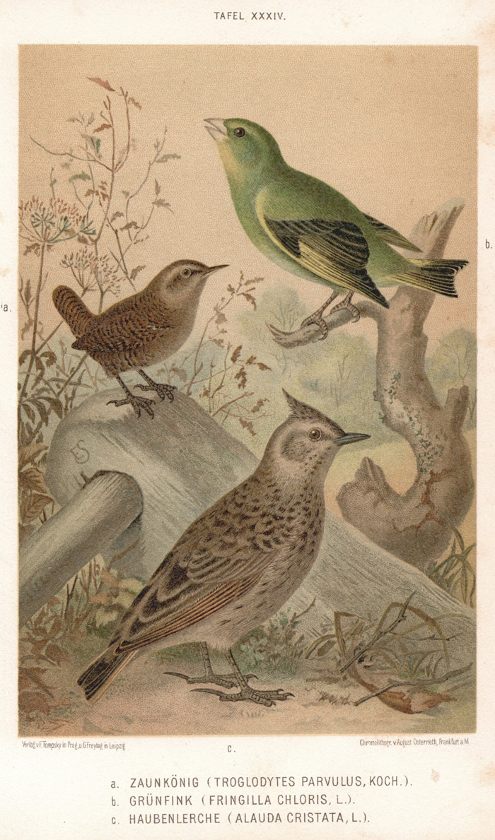 Als ein gemeiner Vogel, der auch nur wenige anziehende Eigenschaften zeigt, ist der Grünling, wie er meistens genannt wird, trotzdem doch recht beliebt und der Volksmund hat auch ihm zahlreiche andere Namen beigelegt: Grünhänfling, Grünschwanz und Grünvogel, grüner Dickschnabel und grüner Kernbeißer, Gröhling, Gröhnschwanz, Grünzling, grüner und gelber Hänfling, Hirsenfink, Hirsenvogel, Rapsfink, Raps- und Kothvogel, Schwaniz, Schwanschel, Schwanzke, römischer Zeisig, Schwoinz, Schwunsche, Schwuntsche oder Zwuntsche, Tutter und Zwunz. In ganz Europa finden wir ihn als Standvogel, von Mittelskandinavien südwärts, sowie auch in Nordwestafrika und Kleinasien, namentlich häufig aber fast allenthalben in Deutschland, und zwar im gemischten Gehölz, welches mit Wiesen und Äckern wechselt, auch in Obstgärten, Weidenpflanzungen, Vorwäldern und besonders in Gegenden mit nassem Grunde. Das reine Nadelholz sowie den tiefen Wald vermeidet er. Zum Mai hin wird das Nest auf Obstbäumchen, jungen Nadelholzstämmen, gern auch auf Weidenköpfen oder in Hecken und Gebüsch, im niedrigen Geäst stärkerer Bäume dicht am Stamm, aus Fasern, Halmen, Quecken und Mos als eine große flache Mulde errichtet und mit Haren und Federn ausgerundet. Das Weibchen baut und bebrütet allein die vier bis sechs bläulichgrauen, mattröthlich und schwärzlich gepunkteten Eier und das Männchen füttert dasselbe, sowie späterhin mit ihm gemeinsam die Jungen. Im Jugendkleid erscheinen diese düstergraugrün mit dunkleren Längsflecken gezeichnet. Zum Juli hin erfolgt gewöhnlich ein zweite Brut. Nach Beendigung derselben streicht die Familie bis zum März Nahrung suchend umher und diese besteht in allerlei Krautsämereien, vorzugsweise ölhaltigen Samen, sowie auch den Kernen von Vogel- und Wachholderberen, Bucheckern u. a. m.