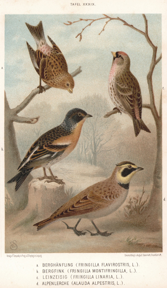 Unter den Wintergästen, welche in bunten Scharen von Goldammern, Feldsperlingen, dann auch Hänflingen, einzelnen Edelfinken u. a. m. aus nördlicheren Gegenden herstreichen, über die schneebedeckten Felder dahinschweifen, an Rainen und abgethauten Stellen Nahrung suchen und allmälig immer mehr südwärts sich wenden, sehen wir auch mancherlei hochnordische Vögel und unter diesen zuweilen in sehr vielköpfigen Schwärmen den Bergfink, dessen Heimat der Norden von Europa und Asien bis in Norwegen, Lappland und Finnland hoch hinauf, soweit noch verkrüppelter Baumwuchs vorkommt, ist.