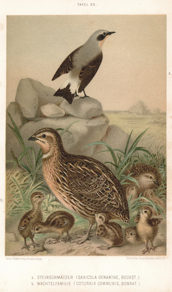 Gegen das Ende der vierten Woche hin sind sie bereits befiedert und zu Ausgang des Monats August fast regelmäßig völlig flügge geworden. Die alten und die jungen Wachteln gewähren ein liebliches Naturbild, wie sie unter beständigem Kopfnicken hin und her laufen, eifrig scharren, hinter fliegenden Kerbthieren hüpfend und sich kugelnd Jagd machen und bei jeder Beängstigung sich in Gras und Gestrüpp drückend, gleichsam spurlos verschwinden, wie sie, sobald sie einigermaßen flügge geworden, aufgescheucht, immer nur auf kurze Strecken hin, niedrig über der Erde fort, doch hurtig und gewandt schwenkend, mit starkem Geräusch davon fliegen. Im September sammeln sie sich allmälig zu Scharen an, wandern dann nachts hochfliegend nach Südeuropa und bekanntlich sogar über's Meer, werden aber auf dem Zuge leider allenthalben in nur zu großer Anzahl hingemordet. Eine Wachtel als Stubenvogel im engen Käfig zu halten, bloß damit man sich an ihrem Schlag oder Ruf erfreue, sehe ich geradezu als eine arge Thierquälerei an; aber auch in der Vogelstube ist sie kein angenehmer Gast, denn sie zeigt sich dummscheu und stürmisch, sodaß sie, nur zu leicht aufgeschreckt, mit dem Kopf gegen die Zimmerdecke tobt, sich selber Schaden zufügt und die Bruten anderer Vögel gefährdet. In großen Flugkäfigen im Freien dagegen hält sie sich vortrefflich und so ist sie auch, namentlich in den zoologischen Gärten, schon mehrfach gezüchtet worden. Die Wachtel wird auch kleines Feldhuhn, Kupfer-, Mohren-, Sand-, Schlag- und Schnarrwachtel genannt.