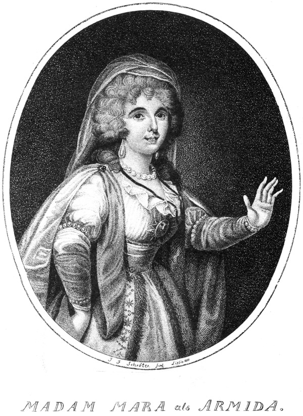 Die Mara, deren Gesang bei allen Vorurteilslosen ein Echo der Bewunderung weckt, bleibt auf der Bühne mancherlei schuldig. Ihre Erotik, die im Stimmklang spürbar ist und ihre Zierkunst beflügelt, vermag nicht, sich unmittelbar der ganzen Erscheinung mitzuteilen, nicht den Weg zu den Sinnen der Zuschauer zu finden. Sie wirkt keine Mimik in ihrem deutschen Durchschnittsgesicht. Auch der mittelgroße Körper schwingt nicht mit. Es ist wahr: die zu Cassel 1749 geborene Elisabeth, die ihre Mutter schon sehr früh verlor, wurde vom Vater, der sie nicht bewachen, unbehindert seinen Geschäften nachgehen wollte, an einen Armstuhl gefesselt und litt nun ihr Leben lang unter einer Schwäche der vielleicht verkrüppelten Beine, die ihr nicht gestattete, lange zu stehen. Aber dies ist nicht das Entscheidende. Sie wird durch etwas anderes verhindert, als italienische Primadonna unmittelbar ausdrucksfähig zu sein.